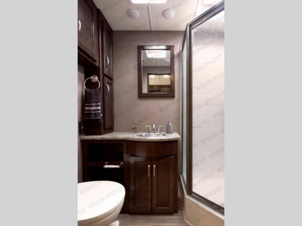 A convenient bathroom between the main living area and the bedroom includes a corner shower, vanity with sink, linen storage, and a toilet. There is also an overhead cabinet along one side for storing towels and toiletries.