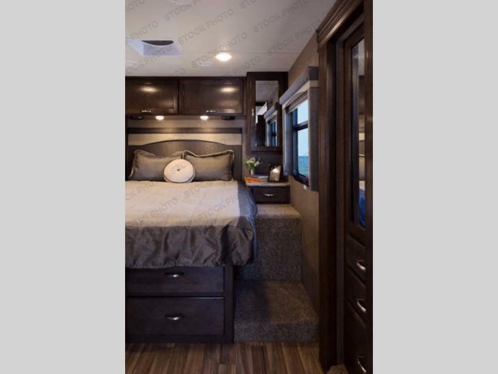 The rear bedroom features a queen size bed with closets on each side, and overhead cabinets. Opposite the bed, along the bathroom wall you will find a 32" LED TV.