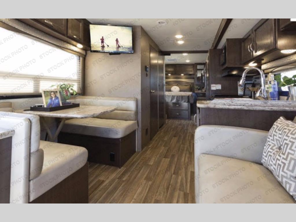 Opposite the sofa you will find a booth dinette with a 40" LED TV overhead. The dinette features two sets of seat belts, with two more on the jack-knife sofa so your backseat travelers can be safe while moving down the road.