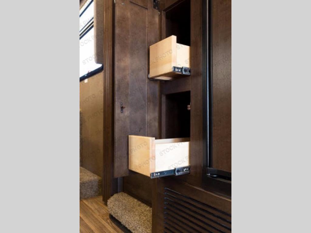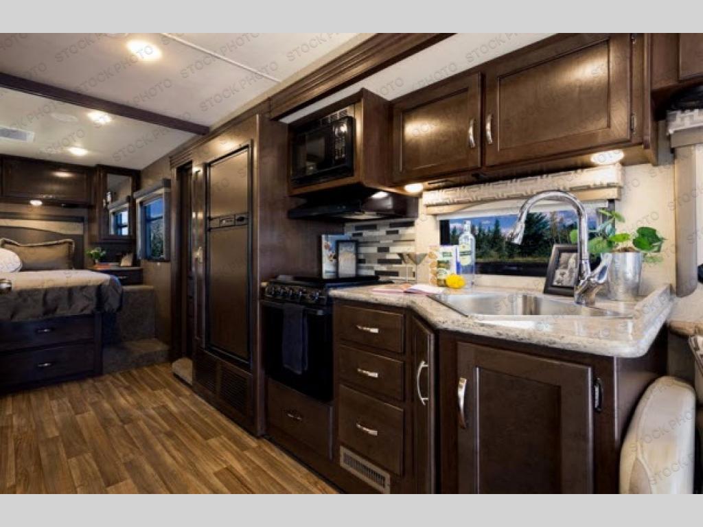 Step inside behind the front passenger seat and notice the spacious interior with a large driver's side slide fully extended. Within the slide out there is a jack-knife sofa, a large sink, counter space, a three burner range with overhead microwave oven, and a pantry, plus a closet in the bedroom.