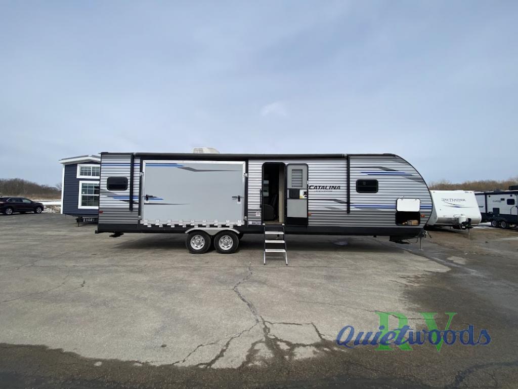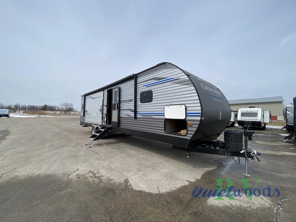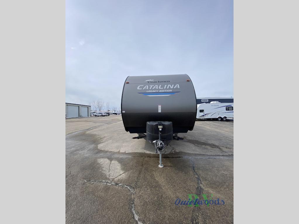 Don't pass up this amazing Catalina Legacy travel trailer! With its exceptional outdoor patio deck, you will want to party outside underneath the 21' electric awning with LED lights every night. The interior is just as exciting with its open living area that is made possible by the single slide that has been added, and the front private bedroom delivers comfortable seclusion as you rest peacefully each night on the queen-size bed.