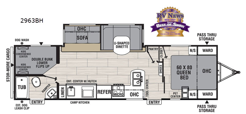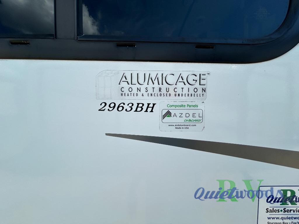 Your kiddos will love staying in this 2963BH travel trailer with the set of rear bunk beds which has two convenience centers for them and the lower bunk flips up too. You can easily access the rear corner bathroom from the outside with one of the two entrance doors leading right into it, and you can keep all of your dirty clothes in one place thanks to the laundry hamper in there too. The U-shaped dinette and sofa slide out provides extra walking around space while still providing a comfortable place to enjoy your meals and relax on at night!