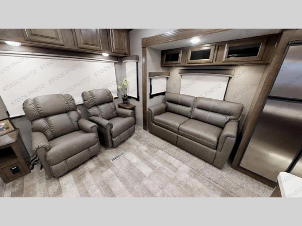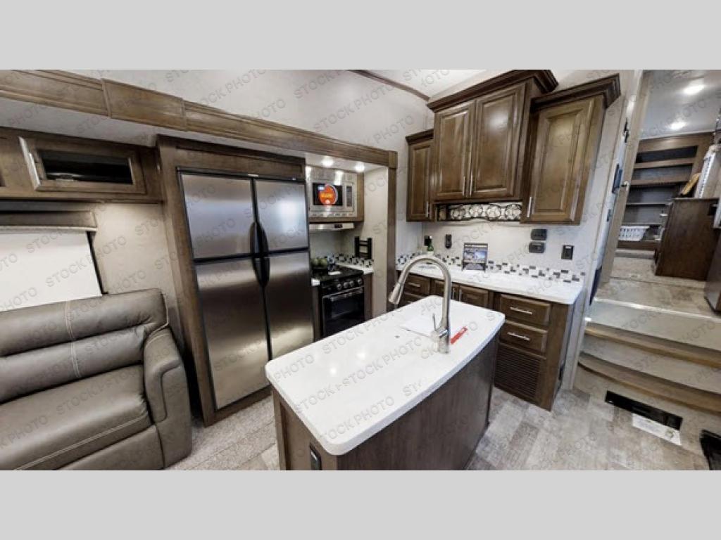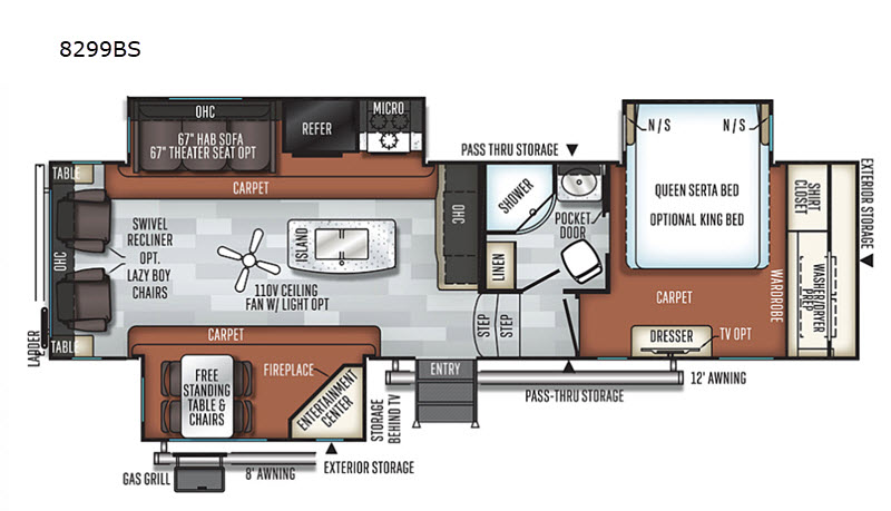 Plan to do some camping and a whole lot of relaxing with this fifth wheel. See just how easy it is to fix your favorite meals for your family in this kitchen. There is plenty of space to work, plus the kitchen island features a double sink and extra counter space. Come relax in the living area that features a hide-a-bed sofa plus there are two recliners along the rear wall or you can choose the optional Lazy Boy chairs. Within the slide out along the curbside there is a corner entertainment center with a fireplace. In the front bedroom you will find a Serta queen bed, a wardrobe that has been prepped for a washer and dryer, plus you can add an optional TV. Outside there are two awnings which offer plenty of shade, and at night you can turn on the LED lights, grab your lawn chairs, and fire up the outside gas grill for hot dogs!