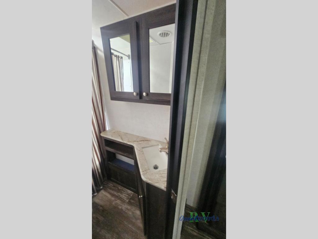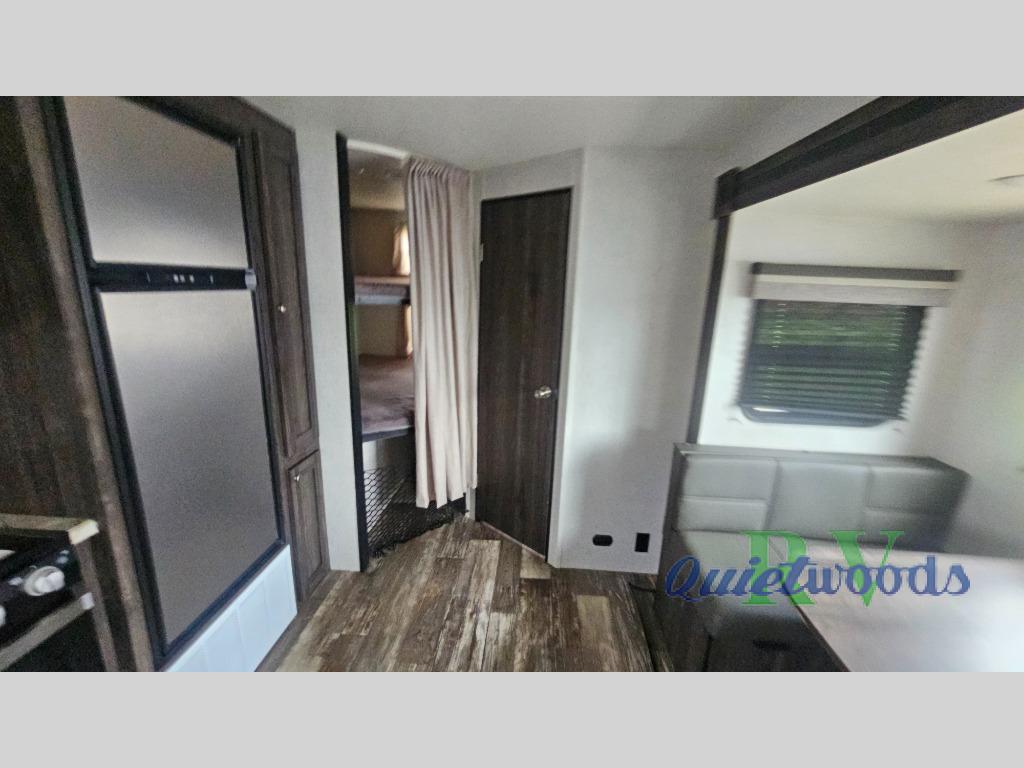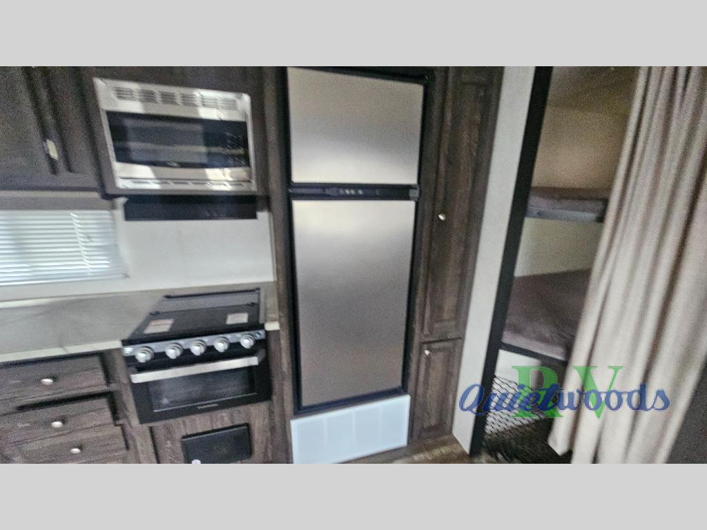 When the great outdoors calls your name, load up the kids and head to your favorite state park in this travel trailer. The large slide out in the living/kitchen area allows you to stretch out and the kids will have space to play a game on the floor. This unit features full kitchen amenities inside as well as an outdoor kitchen for when the weather is nice. The kids will love climbing into the double bunk beds each night and the front private bedroom with a queen bed will remind you of home. This travel trailer also includes a booth dinette and a sofa that can convert to comfortable sleeping space for additional guests.