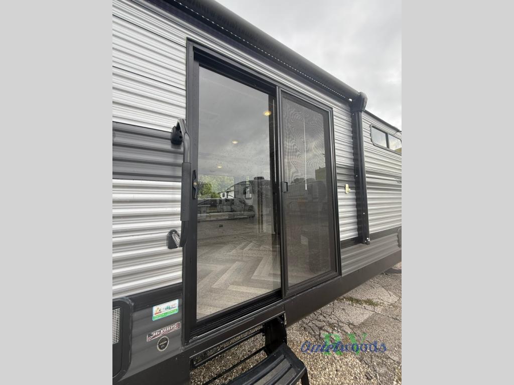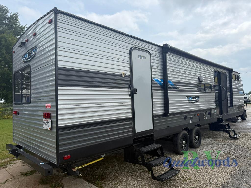 After you've had a long day of sightseeing and adventuring, you will certainly appreciate having this Salem travel trailer to come back to! If you aren't ready to stay indoors for the night, you can keep the party going outside under the 18' awning, and if you need any extra lawn chairs, you can grab them from the pass-through storage compartment. And, you don't have to stop enjoying a good fire just because you have to go inside because the interior fireplace will provide great ambiance. There are dual entry doors which will definitely come in handy when camping with a large group, and there is plenty of seating space on the booth dinette and versa lounge in the main living area.