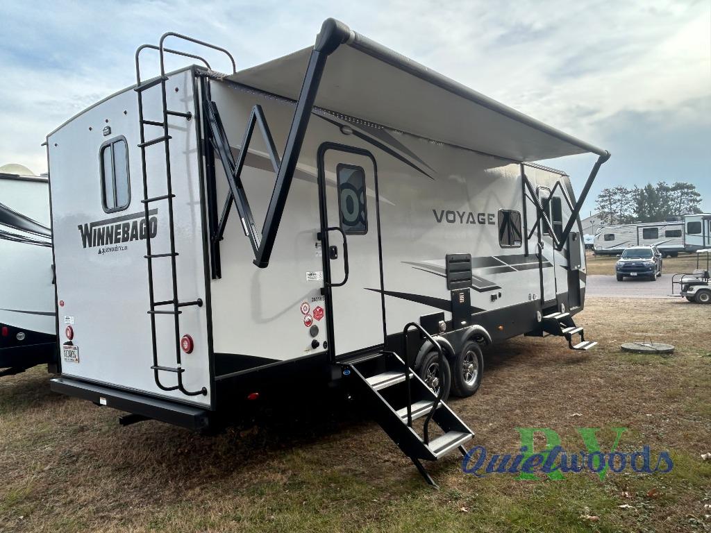 Each Voyage travel trailer by Winnebago Industries Towables includes two 100-watt solar panels with a charge control monitor so you can camp off-grid, satellite and antenna connections, and an antenna with wifi prep. Also included is a heated and enclosed underbelly with thermo foil insulation for four seasons of travel, a gel coat fiberglass front cap with integrated LED lighting, walk-on roof decking, plus four-point power/electric stabilizers for easy setup and stability. The interior offers comforts of home, large windows, ceiling LED lights, ductless flooring throughout, and full kitchen amenities. No voyage is better than the one taken in the Voyage travel trailer!
