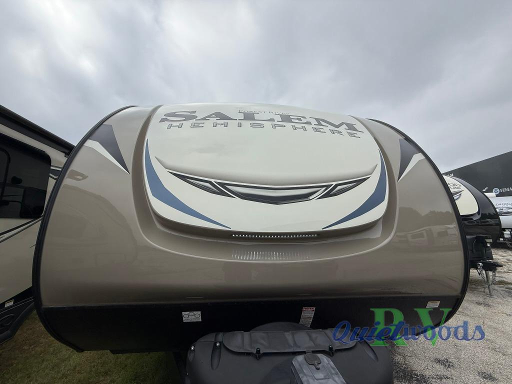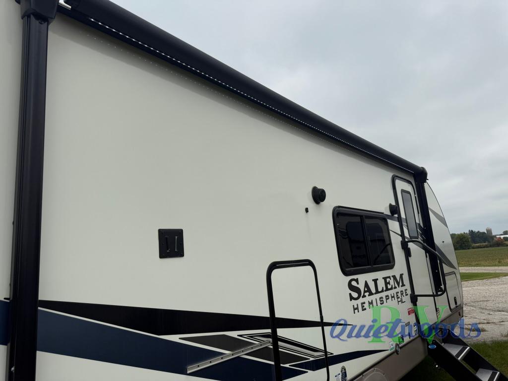 This Salem Hemisphere Hyper-Lyte trailer is perfect for a couple or even three or four if you don't mind converting the dinette for added sleeping space. You will love the panoramic windows that bring your surrounding views right inside, and on a sunny day keeps it light and airy along with the skylight overhead in the main living area as well as added space thanks to the large slide. Snuggle up each night on the RV queen bed for a great night's rest and enjoy the 30" x 36" walk-in shower with skylight as you wake. A 16' awning provides added living space and protection from the elements if you want to enjoy as much time outdoors as possible. Outside refrigerator, a LP quick-connect hook-up for your griddle/grill, and spray port for cleaning up. No worries about packing all of your fun games both inside and out, with the Texas size pass-through storage you can bring it all along!