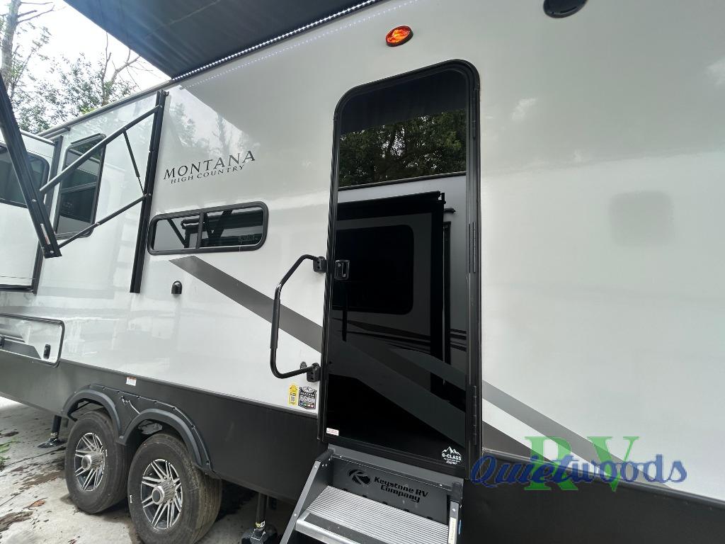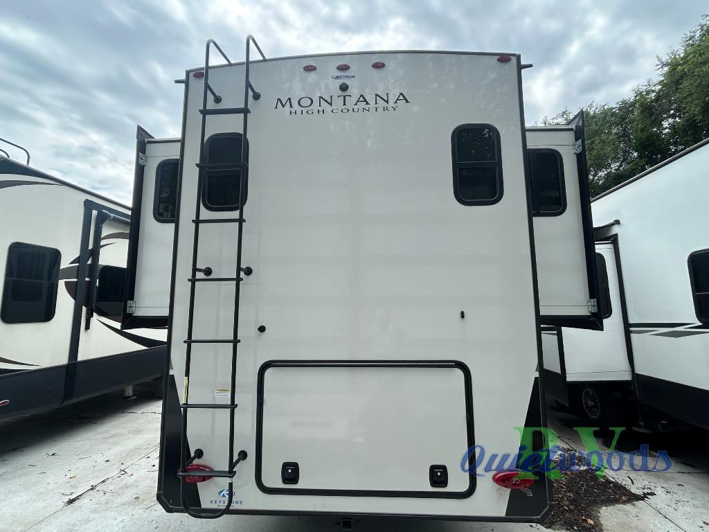 You'll be able to love this Montana High Country fifth wheel for years and years and years! The separated living room in the back feels just like your living room at home with its power theater seating, two hide-a-bed sofas, fireplace, and 50" LCD TV. The kitchen is also very residential with its three-burner range with glass top, residential microwave, residential refrigerator, pantry, and coffee station. When you enter this unit, there is a coat closet for you to place your boots and hats in, and for more clothing storage, just use the under-bed storage up in the private bedroom.