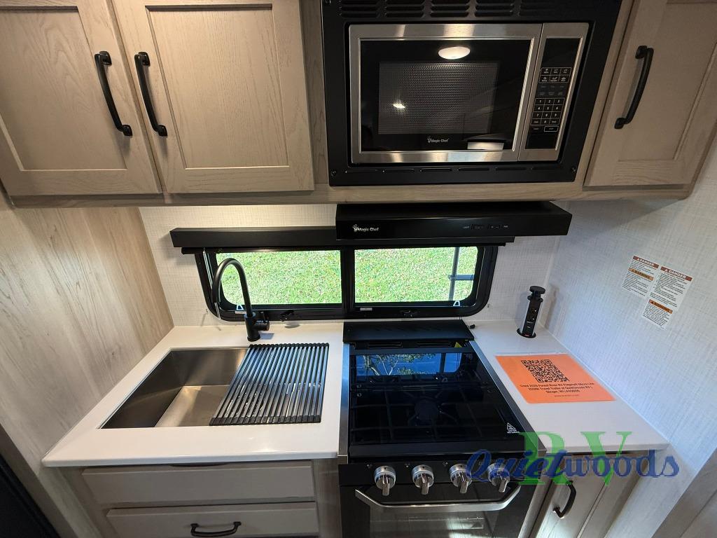 Trips to your favorite campground are made complete with this dual slide out, dual entry trailer! One entry goes straight into the front master bedroom where you'll find an RV queen bed with flip-up storage, a wardrobe slide out, and easy access into the walk-through bath. Once you're through the bath, you'll find the main living area, rear kitchen, and the second entry door at the back. Your crew can play a game at the 39" booth dinette or relax on the theater seat across from the TV. The kitchen includes everything you need to prepare meals in the morning, including a three burner cooktop and microwave oven, plus a 12V refrigerator and a pantry for food storage.